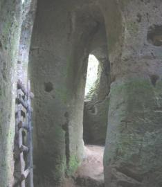 | but it became clear I was on an ancient track and I did find something amazing : I discovered a carved out city ... I went into a cave but carved out columns went deep inside and there was a carved out gallery inside overlooking the main chamber. WOW - I didn't get any photos I see there is a similar cave north of Pitigliano : Via cava di San Sebastiano.. they look similar