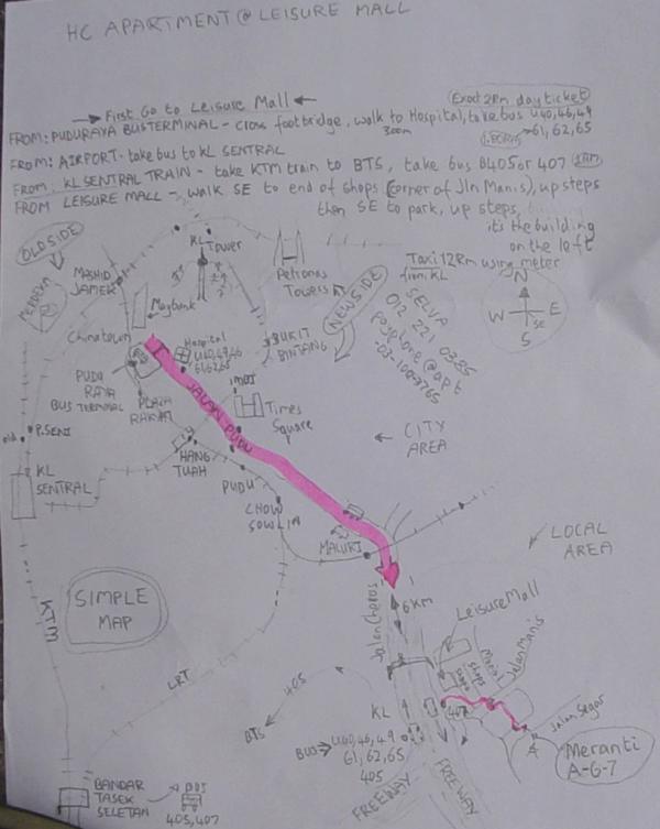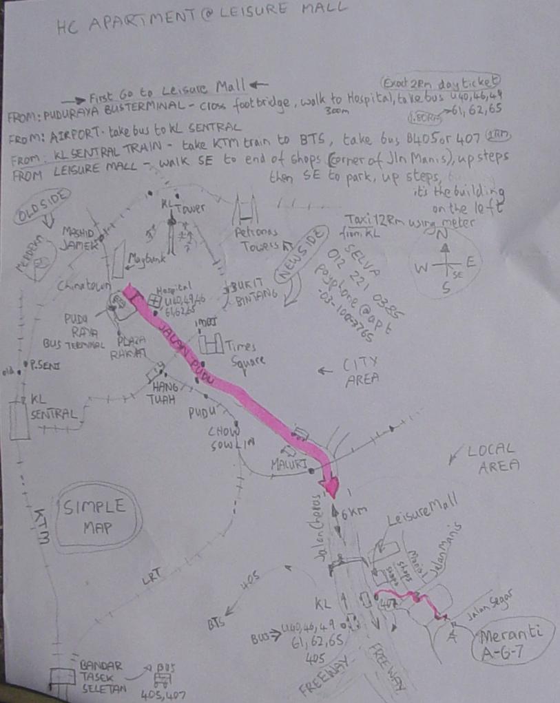 NB. for KLCC Twin Towers buses U46 and 62,65 go via Bukit Bintang when they come into town. From Bukit Bintang LRT you can walk through the Pavillion shopping centre to KLCC Twin Towers - Don't use Mafia Taxis - most taxi drivers are OK, but in tourist areas like Puduraya Bus Terminal or KLCC Mafia Taxi drivers wait with Mafia prices, walk away and stop a taxi which is moving or take a LRT or Bus to another area first. - Taxi Directions - Tell him Leisure Mall, Petronas Petrol Station, then Jalan Hartmas. The building is called Meranti call me when you arrive Taxis have meters and by law must use them, they use very cheap LNG fuel, so the fare should be 12Rm from the city when there is no traffic jam.